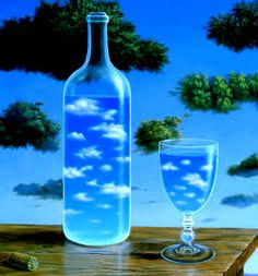 Clouds (after looking at Magritte) by L.B. Williams A cloud mottled bottle on a brown wooden table a wine glass brimming with cloud filled lakes the sky everywhere green cumulus ferns falling