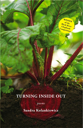 Twenty-five years later, a constellation of events caused her to rethink her relationship with poems. A dear friend was diagnosed with cancer, quickly deteriorated, and died. It became clear that her son, who is autistic, was not going to make the much-prayed-for miraculous recovery and that she would have to leave her job at the college where she had worked for over a decade in order to care for him. There were two wars on the television. Her parents were aging. Sandra didn’t have time for fiction. But she knew that she had to write, so she returned to poetry. “Anwar Sadat’s Wife’s Lover”, one of the poems in Turning Inside Out, was written the weekend that she saw her friend for the first time after his diagnosis. “Gleaning” was written after he died. Turning Inside Out is a collection of new poems, written in 2005 and later, and old ones that had been in storage since the early 80’s. Shortly after putting the book together, it won the Black River Chapbook Competition.